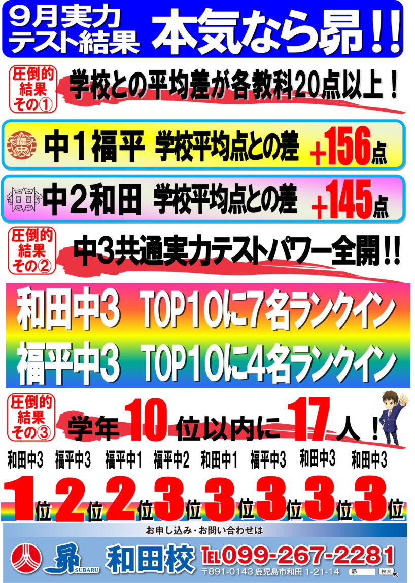 トップ教室からのお知らせ鹿児島県和田校昴 和田校生 大躍進!「9月実力テスト結果発表」 教室からのお知らせ 昴 和田校生 大躍進!「9月実力テスト結果発表」 和田校 2024年9月26日(木) 圧倒的な昴生の実力をご覧ください! お申し込み・お問い合わせはコチラまで お知らせ一覧へ戻る