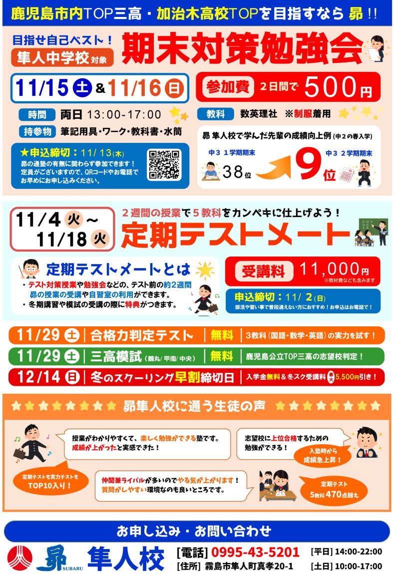 トップ教室からのお知らせ鹿児島県隼人校昴 隼人校【2学期】中学生向けイベント情報! 教室からのお知らせ 昴 隼人校【2学期】中学生向けイベント情報! 隼人校 2025年10月13日(月) お申し込みは今スグ! 各種イベントへのお申し込みは[昴 隼人校]まで お知らせ一覧へ戻る
