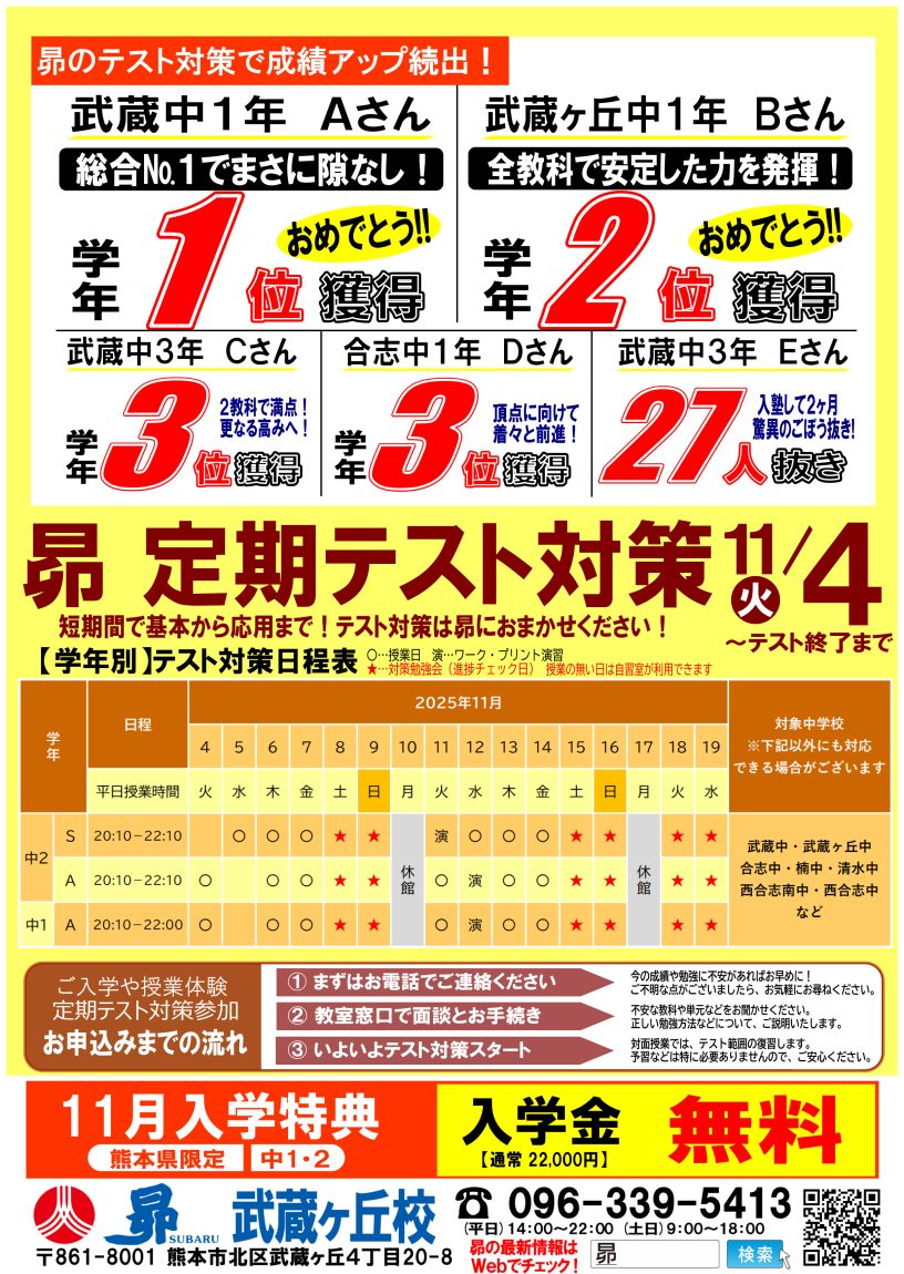 トップ教室からのお知らせ熊本県武蔵ヶ丘校昴 武蔵ヶ丘校「中1・2限定 定期テスト対策 」好評受付中! 教室からのお知らせ 昴 武蔵ヶ丘校「中1・2限定 定期テスト対策 」好評受付中! 武蔵ヶ丘校 2025年10月13日(月) 成績アップ続出!お申し込みは今すぐ! 詳しくは、お電話にてお気軽にお問い合わせください。心よりお待ちしております。 お知らせ一覧へ戻る
