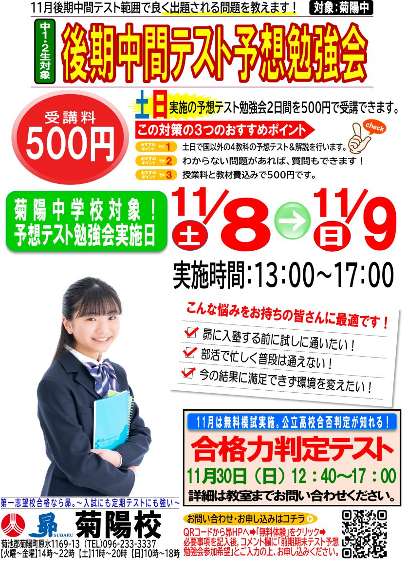 11月8日(土)・9日(日)「菊陽中 後期中間テスト予想勉強会」を実施します!