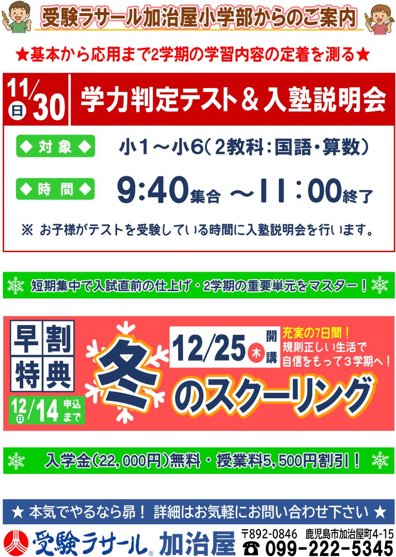 受験ラサール加治屋【小学部】 「2025 冬のスクーリング」入塾説明会のご案内