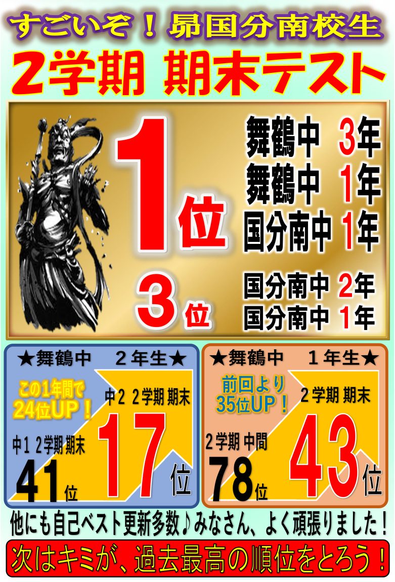 トップ教室からのお知らせ鹿児島県国分南校昴 国分南校生「2学期期末テスト結果速報!」 教室からのお知らせ 昴 国分南校生「2学期期末テスト結果速報!」 国分南校 2025年12月16日(火) 昴 国分南校生 上位独占! 次はキミの番だ! お知らせ一覧へ戻る