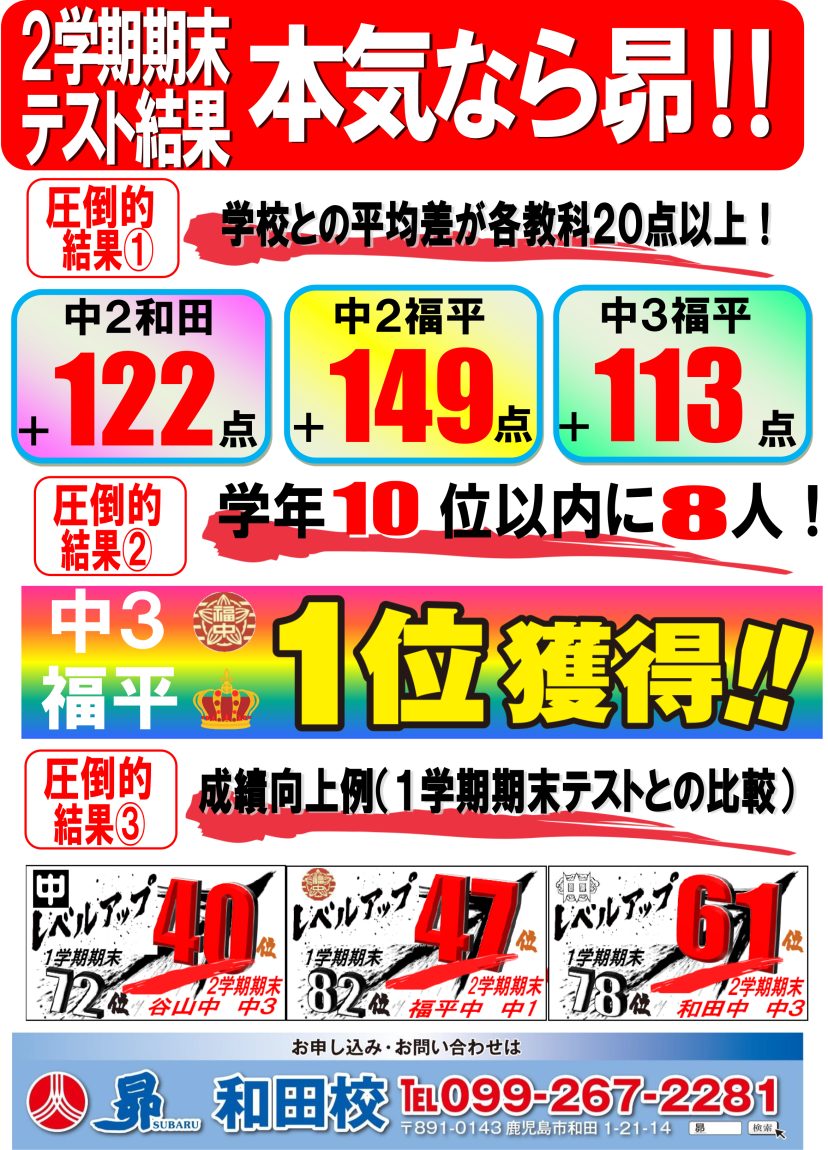 トップ教室からのお知らせ鹿児島県和田校昴 和田校「2学期期末テスト結果発表!」 教室からのお知らせ 昴 和田校「2学期期末テスト結果発表!」 和田校 2025年12月16日(火) 昴 和田校生、圧倒的成績アップ! 次はキミの番だ! お知らせ一覧へ戻る