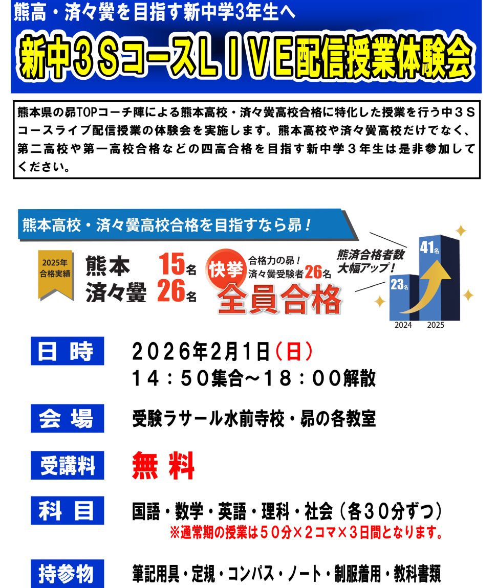 2/1(日)開催「新中3 SコースLIVE配信授業体験会」お申し込み受付中!