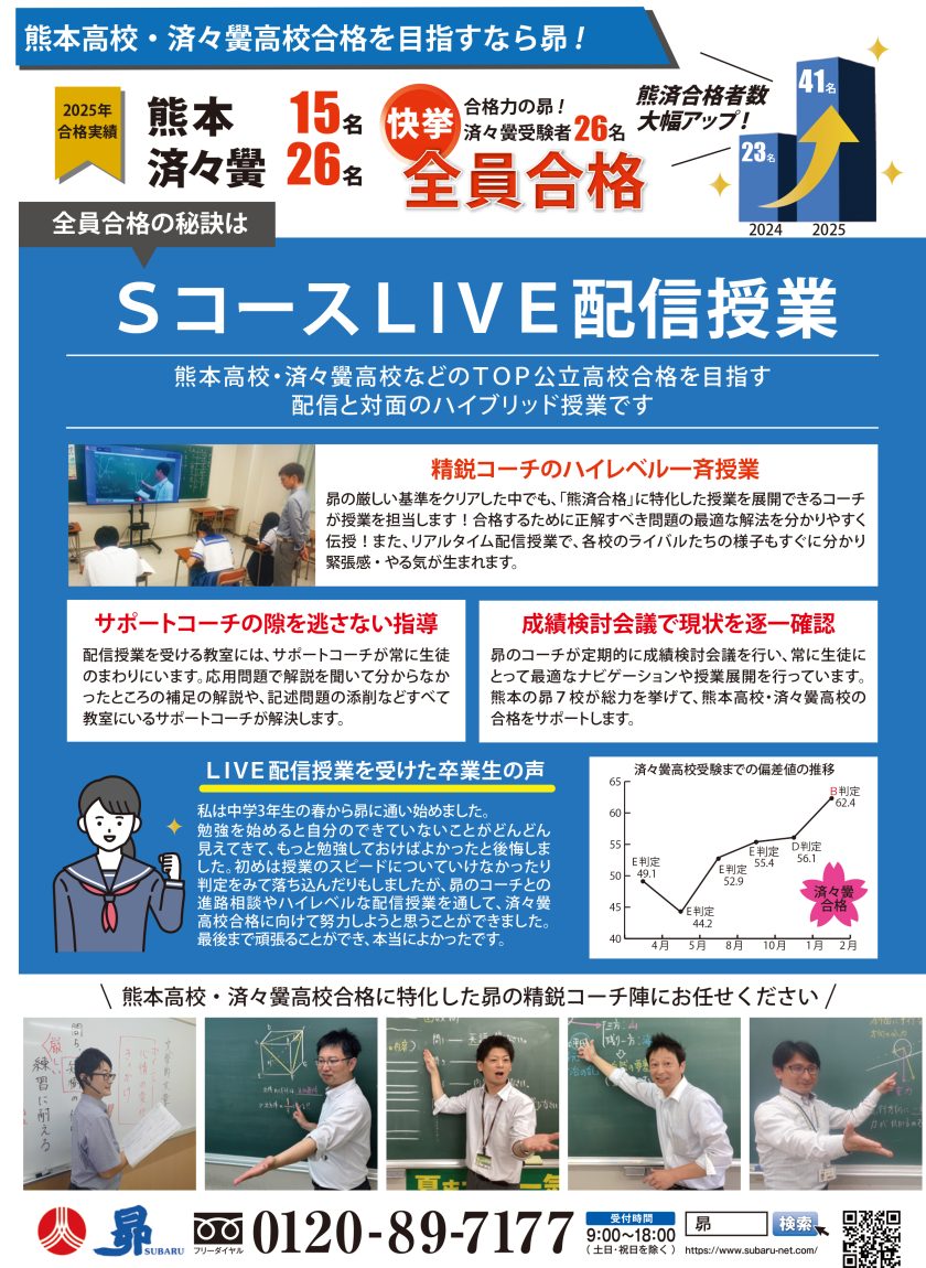 「2025年度 済々黌 全員合格」を成し遂げた昴の配信授業を受けてみませんか?