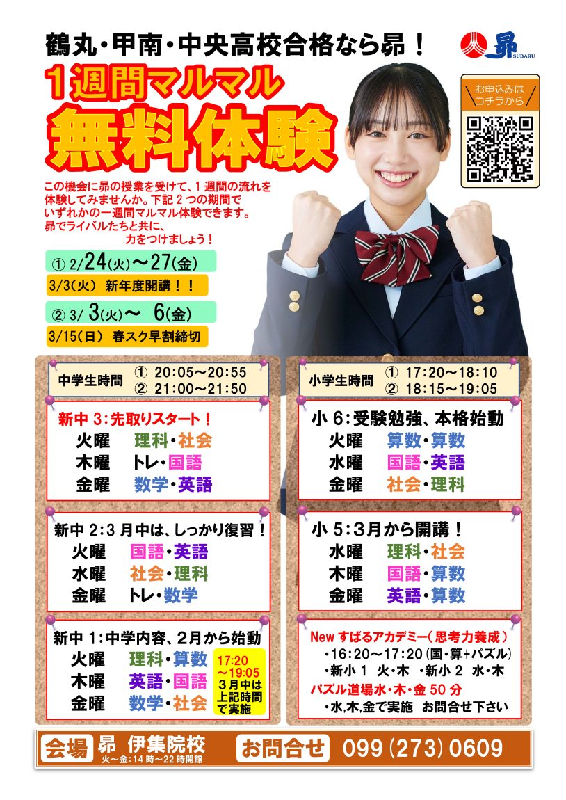 トップ教室からのお知らせ鹿児島県伊集院校「1週間マルマル無料体験!」 教室からのお知らせ 「1週間マルマル無料体験!」 伊集院校 2026年1月21日(水) 一週間、昴の授業を受けてみませんか。 学校の宿題や部活との兼ね合いを、この機会に確認して、3月から一緒に頑張りませんか。 「無料体験」のお申し込みはコチラから 各種お問い合わせは昴 伊集院校まで! お知らせ一覧へ戻る