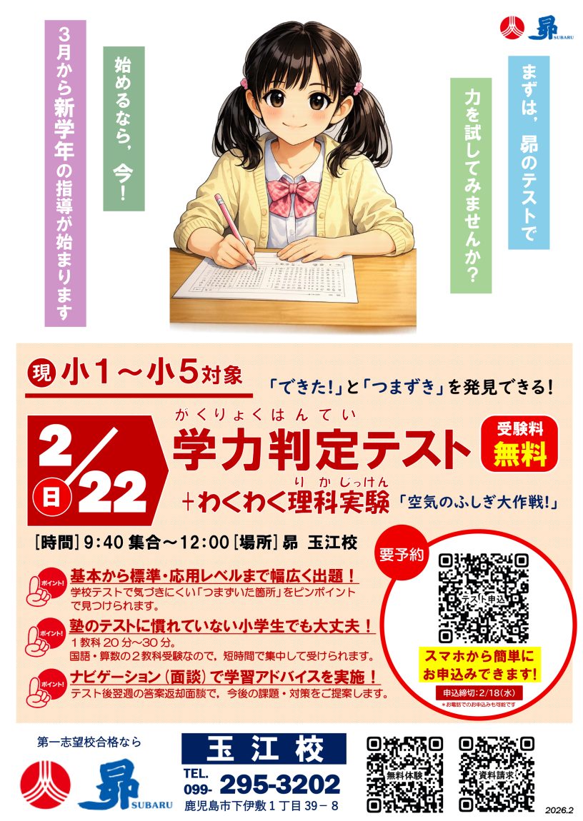 トップ教室からのお知らせ鹿児島県玉江校2/22(日)実施「学力判定テスト」お申し込み受付中! 教室からのお知らせ 2/22(日)実施「学力判定テスト」お申し込み受付中! 玉江校 2026年1月23日(金) お子様の「今の学力」を正確に判断できる! 【学力判定テスト】のお申し込みはコチラから お知らせ一覧へ戻る