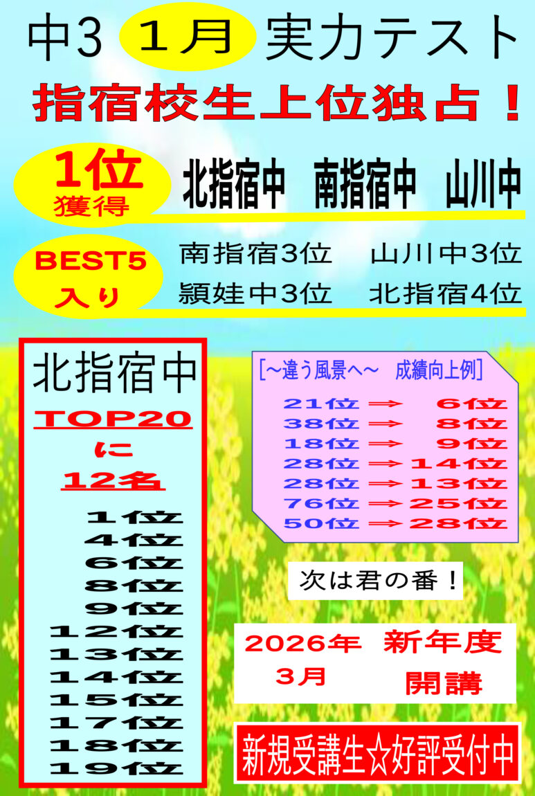 トップ教室からのお知らせ鹿児島県指宿校昴 指宿校「1月 実力テスト結果!」 教室からのお知らせ 昴 指宿校「1月 実力テスト結果!」 指宿校 2026年1月30日(金) 昴 指宿校生 上位独占! 鶴丸・甲南・中央・指宿高校上位合格なら昴! お知らせ一覧へ戻る