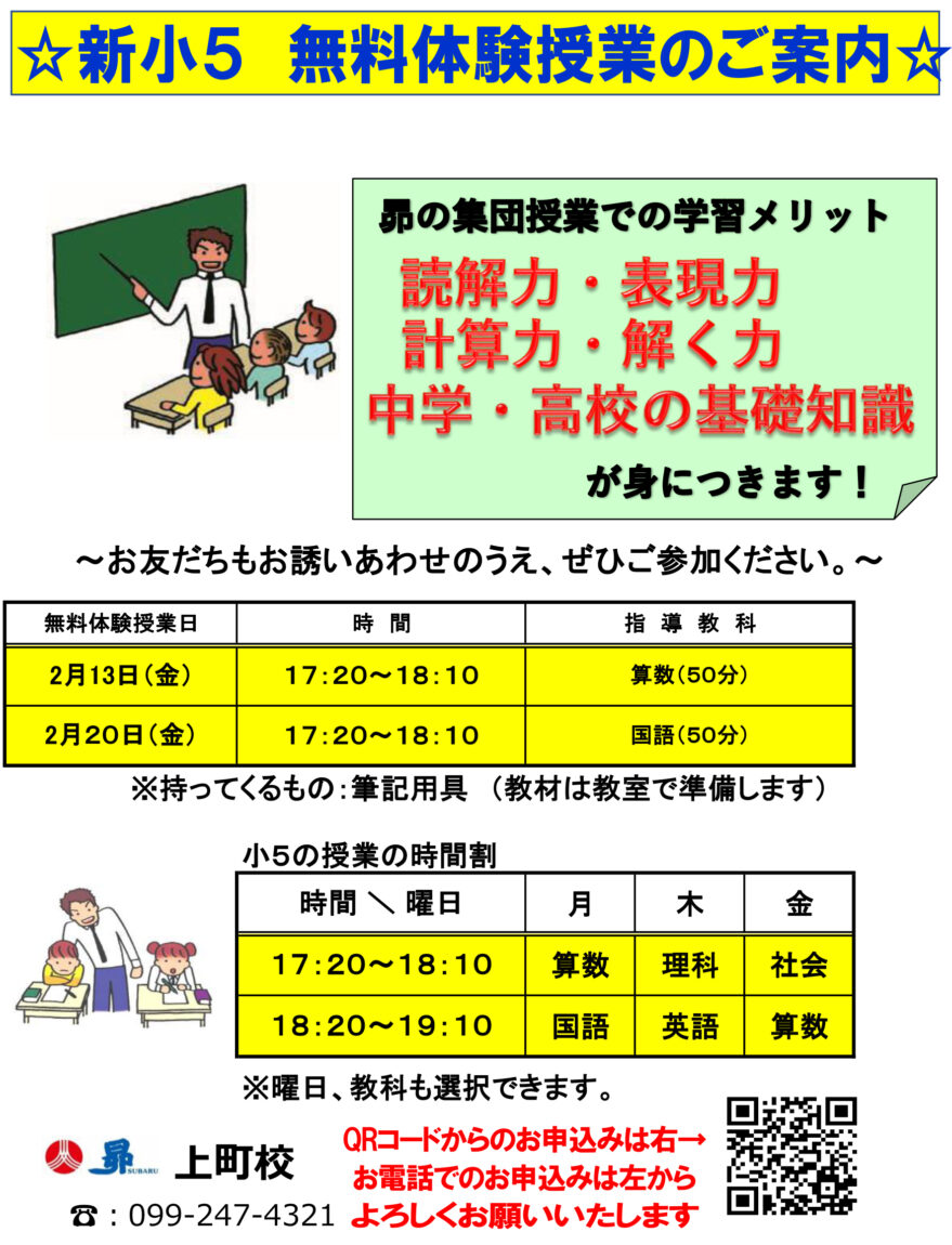 昴 上町校【新小5 無料体験授業】のお知らせ