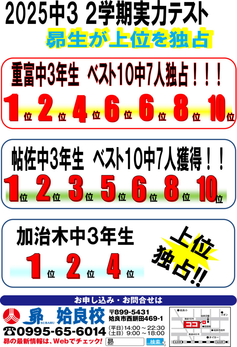 トップ教室からのお知らせ鹿児島県姶良校昴 姶良校「中3 2学期実力テスト結果!」 教室からのお知らせ 昴 姶良校「中3 2学期実力テスト結果!」 姶良校 2026年2月12日(木) 昴 姶良校生 上位独占! お知らせ一覧へ戻る