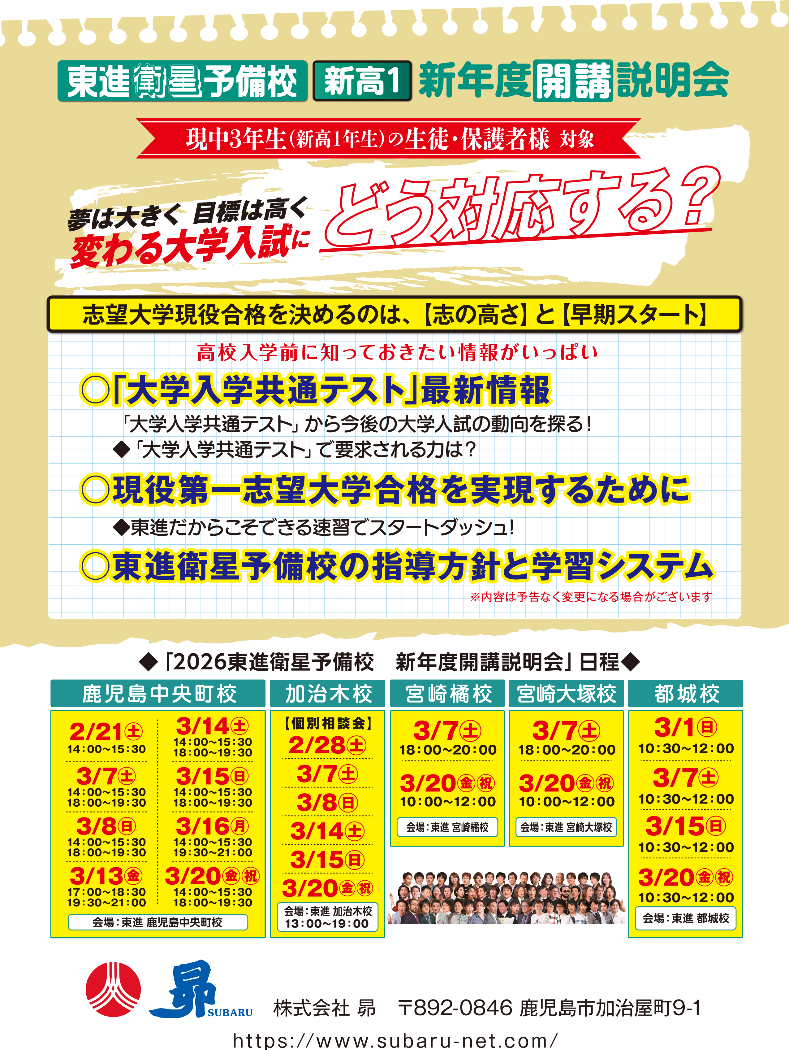 トップ教室からのお知らせ宮崎県東進衛星予備校 宮崎橘校『新高1 新年度開講説明会』開催! 教室からのお知らせ 『新高1 新年度開講説明会』開催! 東進衛星予備校 宮崎橘校東進衛星予備校 都城校東進衛星予備校 宮崎大塚校東進衛星予備校 鹿児島中央町校東進衛星予備校 加治木校 2026年2月19日(木) 東進衛星予備校で、志望大学現役合格! 高校入学前に知っておきたい情報がいっぱい!お気軽にご参加ください! 詳しくはコチラ お知らせ一覧へ戻る