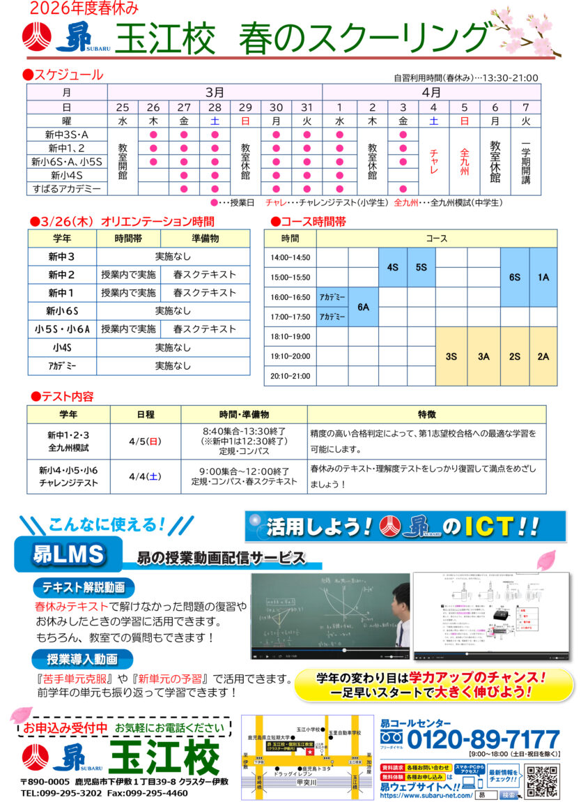 トップ教室からのお知らせ鹿児島県玉江校昴 玉江校「春のスクーリング」お申し込み受付中! 教室からのお知らせ 昴 玉江校「春のスクーリング」お申し込み受付中! 玉江校 2026年2月23日(月) まずはお気軽にお問い合わせください! 資料請求・お問い合わせはコチラから! お知らせ一覧へ戻る