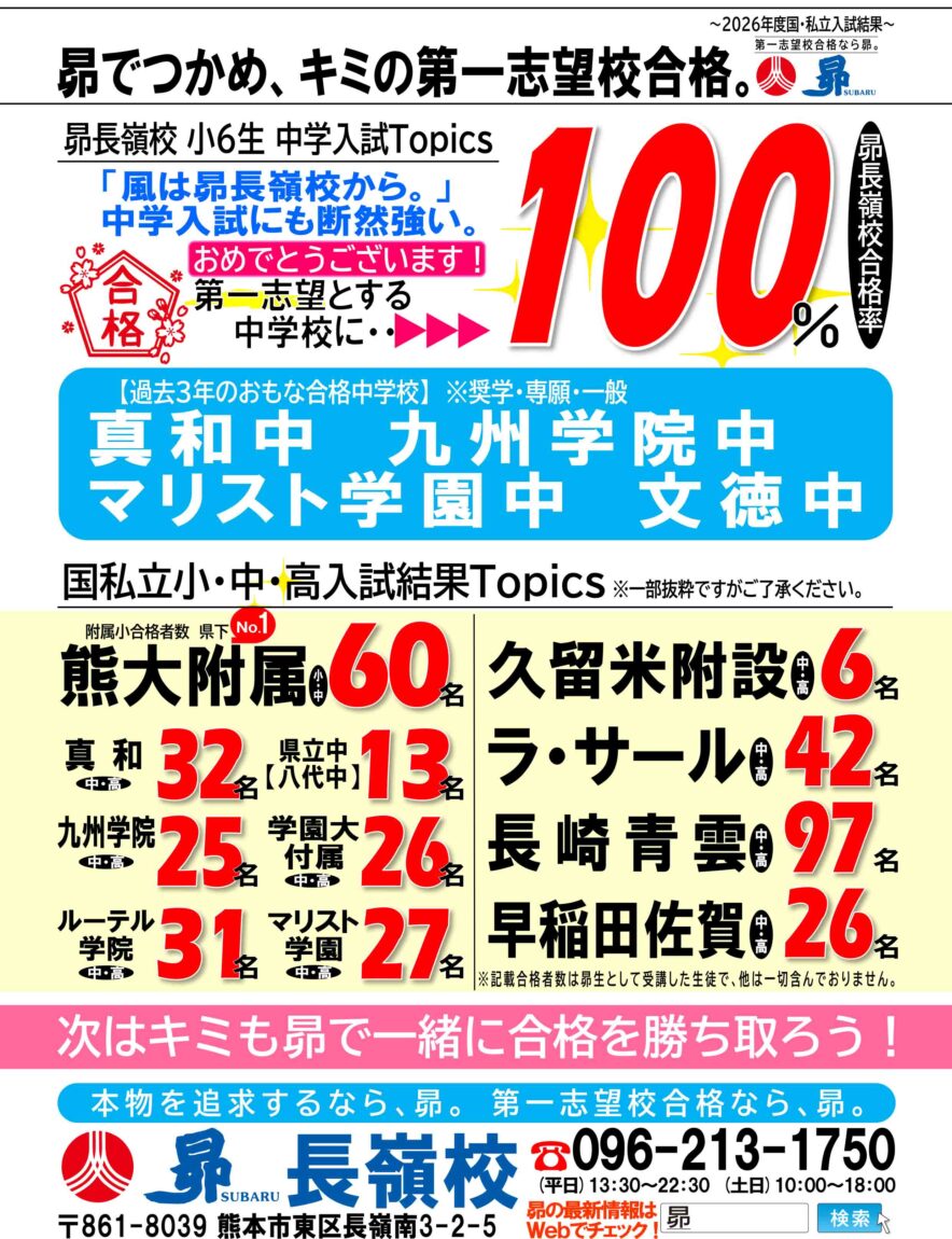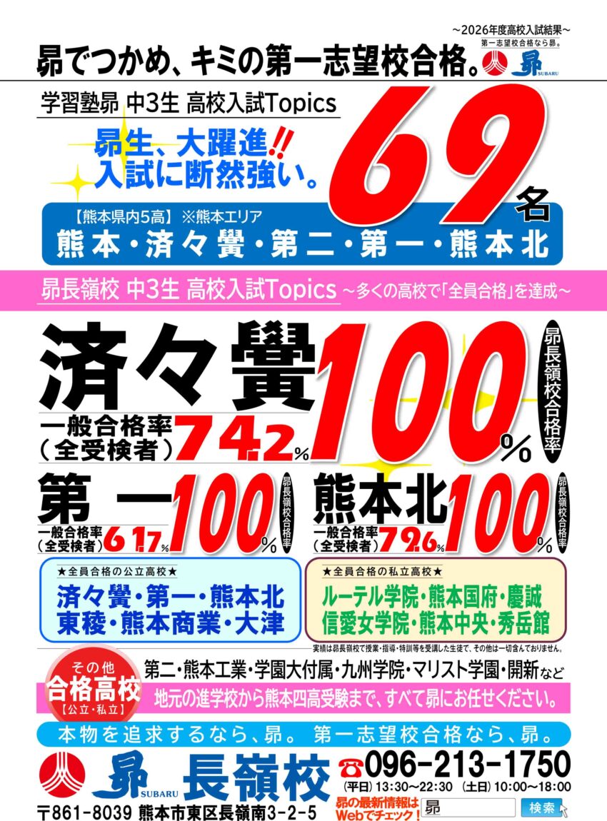 トップ教室からのお知らせ熊本県長嶺校昴 長嶺校「2026年 合格速報!(3/16更新)」 教室からのお知らせ 昴 長嶺校「2026年 合格速報!(3/16更新)」 長嶺校 2026年3月16日(月) おめでとう!昴 長嶺校生!次はキミの番だ! ~想いは伝わる、願いは叶う。第一志望校合格へ一切の妥協なし。~ お申し込み・お問い合わせは昴 長嶺校まで! お知らせ一覧へ戻る