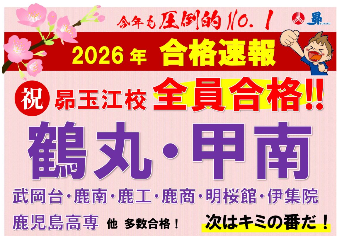 トップ教室からのお知らせ鹿児島県玉江校昴 玉江校「2026年 合格速報!(3/18更新)」 教室からのお知らせ 昴 玉江校「2026年 合格速報!(3/18更新)」 玉江校 2026年3月18日(水) おめでとう!昴 玉江校生!次はキミの番だ! お申し込み・お問い合わせは昴 玉江校まで! お知らせ一覧へ戻る