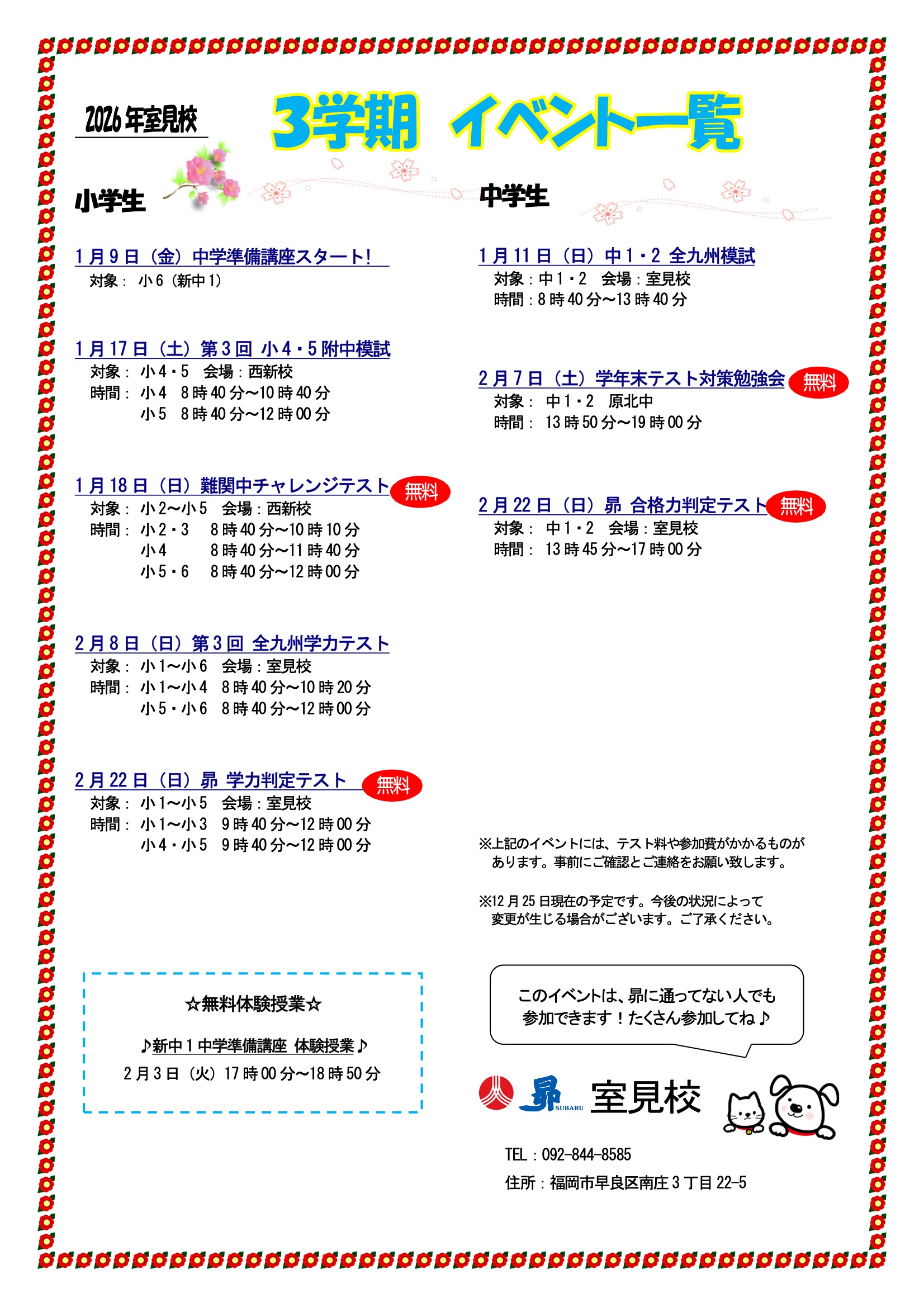 トップ教室からのお知らせ福岡県室見校 教室からのお知らせ 室見校 20261/5 (月) 3学期イベントのお知らせ 202511/12 (水) 昴 室見校「昴の冬期講習」受付中! 202511/12 (水) 昴 室見校「12月入学生」受付中! 202511/12 (水) 11/30(日)中1・2対象「合格力判定テスト」お申し込み受付中! 202511/12 (水) 11/30(日)小学生対象「学力判定テスト」お申し込み受付中! 20259/12 (金) 9/20(土)実施「小6学力判定テスト」お申し込み受付中! 20258/27 (水) 【終了】2学期イベントのお知らせ 20253/31 (月) 【終了】1学期イベントのお知らせ 20251/15 (水) 【終了】3学期イベントのお知らせ 20248/23 (金) 【終了】2学期イベントのお知らせ 20247/12 (金) 個別指導コース 夏期講習案内 20246/13 (木) 昴 室見校「個別指導コース」無料体験授業受付中! 20246/13 (木) 6/23(日)実施!小学生対象「学力判定テスト」 20245/17 (金) 5/28(火)スタート!「昴の定期テスト対策授業」 20243/29 (金) 【終了】1学期イベントのお知らせ 20241/24 (水) 学年末テスト対策授業&直前無料勉強会のご案内 20241/12 (金) 【終了】3学期イベントのお知らせ 20238/21 (月) 【終了】2学期イベントのお知らせ 20238/21 (月) 室見校「個別コース」新規開設! 20233/31 (金) 【終了】1学期イベントのお知らせ