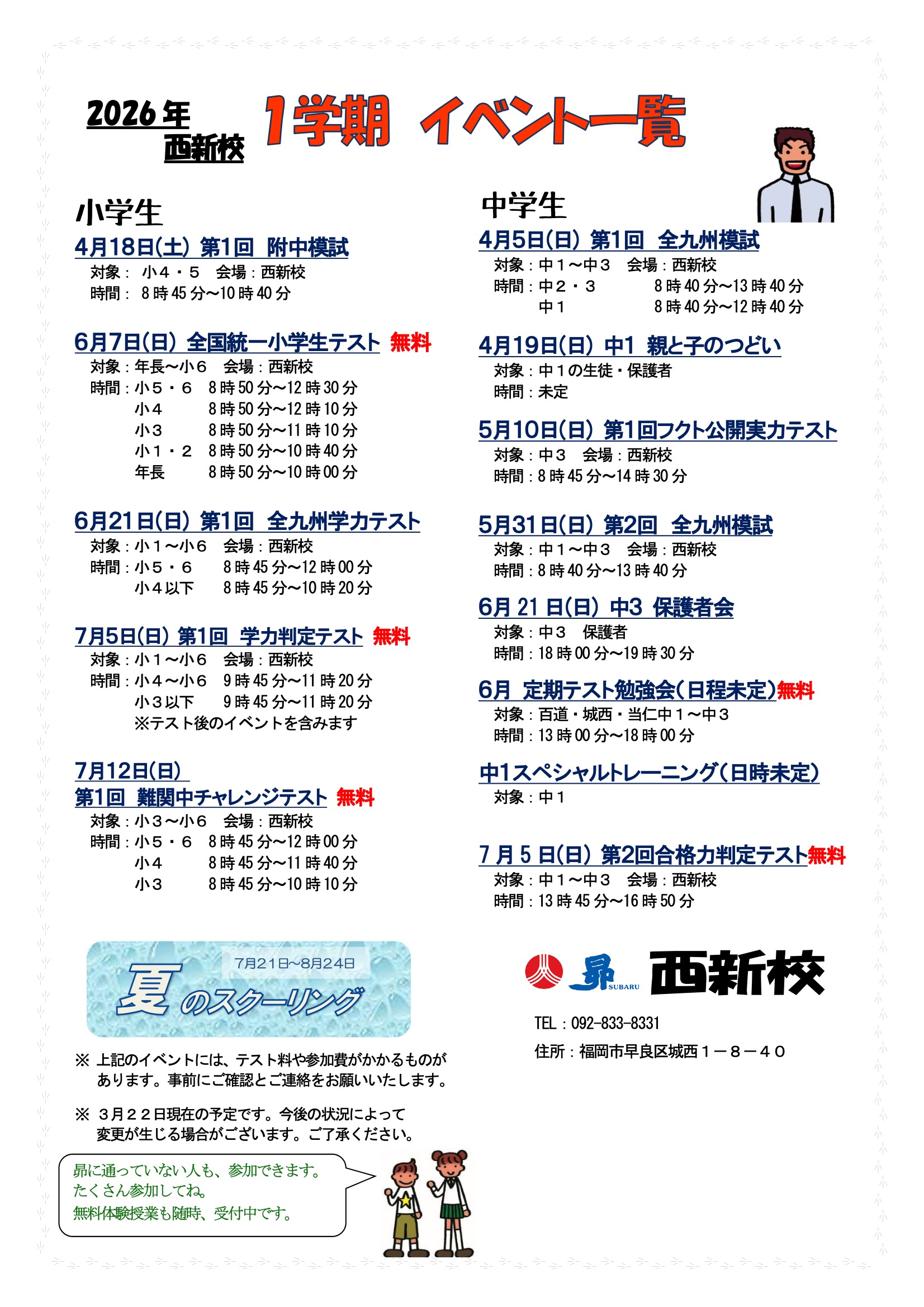 トップ教室からのお知らせ福岡県西新校 教室からのお知らせ 西新校 20263/30 (月) 1学期イベントのお知らせ 20261/5 (月) 【終了】3学期イベントのお知らせ 20259/12 (金) 9/20(土)実施「小6学力判定テスト」お申し込み受付中! 20258/27 (水) 【終了】2学期イベントのお知らせ 20253/31 (月) 【終了】1学期イベントのお知らせ 20251/15 (水) 【終了】3学期イベントのお知らせ 20248/23 (金) 【終了】2学期イベントのお知らせ 20246/6 (木) 7/6(土) 年長児~小4対象「パズル道場親子体験会」 20246/6 (木) 6/23(日) 小学生 学力判定テスト&イベント(無料) のお知らせ 20245/17 (金) 5/28(火)スタート!「昴の定期テスト対策授業」 20243/29 (金) 【終了】1学期イベントのお知らせ 20241/24 (水) 学年末テスト対策授業&直前無料勉強会のご案内 20241/12 (金) 【終了】3学期イベントのお知らせ 20238/21 (月) 【終了】2学期イベントのお知らせ 20233/31 (金) 【終了】1学期イベントのお知らせ 20231/6 (金) 【終了】3学期イベントのお知らせ 202212/28 (水) ★☆2学期期末テスト結果 西新校生 成績アップ者続出!☆★ 20227/13 (水) ★☆1学期期末テスト結果 西新校生 大幅成績UP!☆★