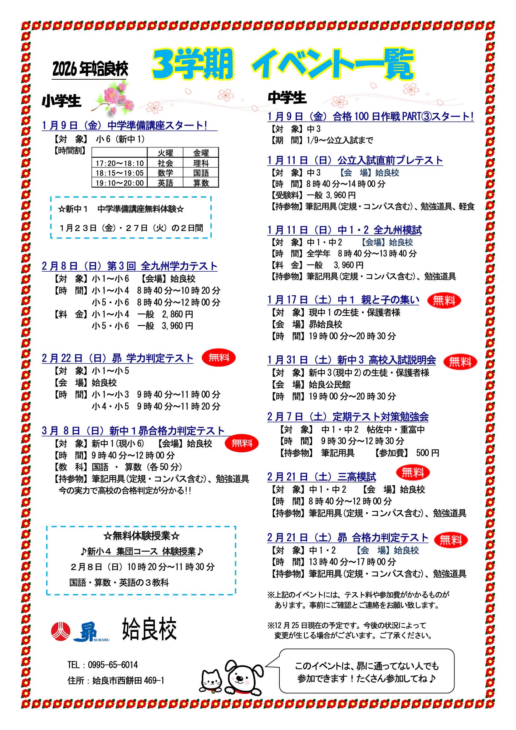 トップ教室からのお知らせ鹿児島県姶良校 教室からのお知らせ 姶良校 20262/12 (木) 昴 姶良校「中3 2学期実力テスト結果!」 20262/12 (木) 昴 姶良校「成績アップ者続出!」 20261/5 (月) 3学期イベントのお知らせ 20258/27 (水) 【終了】2学期イベントのお知らせ 20253/31 (月) 【終了】1学期イベントのお知らせ 20251/15 (水) 【終了】3学期イベントのお知らせ 20248/23 (金) 【終了】2学期イベントのお知らせ 20243/29 (金) 【終了】1学期イベントのお知らせ 20241/12 (金) 【終了】3学期イベントのお知らせ 20238/21 (月) 【終了】2学期イベントのお知らせ 20233/31 (金) 【終了】1学期イベントのお知らせ 20231/6 (金) 【終了】3学期イベントのお知らせ 20227/22 (金) ★☆1学期期末テスト結果 姶良校生 上位を独占!☆★