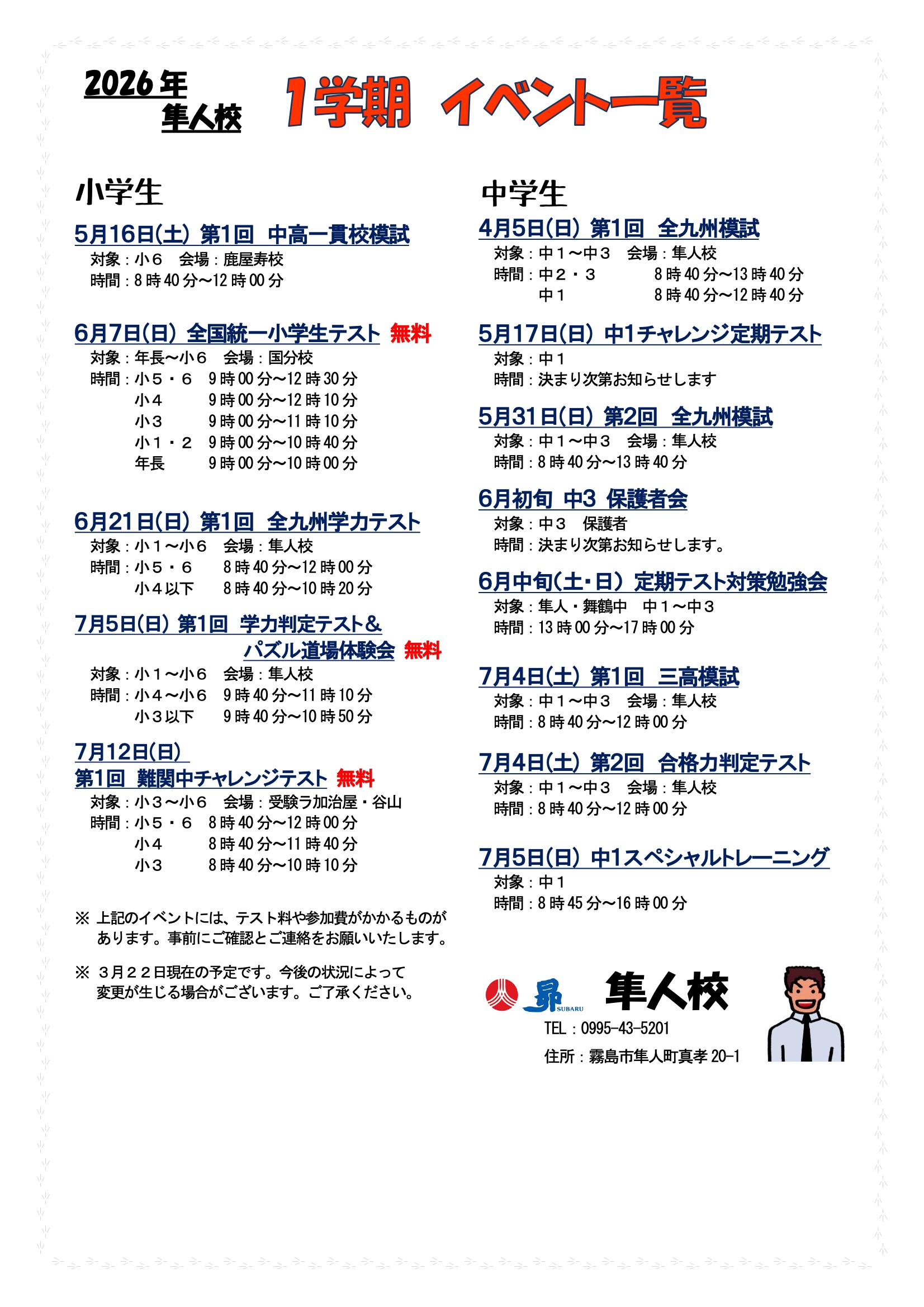 トップ教室からのお知らせ鹿児島県隼人校 教室からのお知らせ 隼人校 20263/30 (月) 1学期イベントのお知らせ 20263/5 (木) 昴 隼人校「学年末テスト結果速報!」 20261/23 (金) 昴 隼人校【3学期】中学生向けイベント情報! 20261/23 (金) 昴 隼人校【3学期】小学生向けイベント情報! 20261/5 (月) 【終了】3学期イベントのお知らせ 202512/11 (木) 昴 隼人校「2学期期末テスト結果速報!」 202510/13 (月) 昴 隼人校【2学期】中学生向けイベント情報! 202510/13 (月) 昴 隼人校【2学期】小学生向けイベント情報! 20258/27 (水) 【終了】2学期イベントのお知らせ 20257/16 (水) 昴 隼人校「1学期期末テスト結果!」 20255/27 (火) 昴 隼人校【6月】中学生向けイベント情報! 20255/27 (火) 昴 隼人校【6月】小学生向けイベント情報! 20253/31 (月) 【終了】1学期イベントのお知らせ 20251/15 (水) 【終了】3学期イベントのお知らせ 202411/7 (木) 昴 隼人校「中1・2 期末テスト対策勉強会 」好評受付中! 20249/27 (金) 昴 隼人校生 大躍進!「9月実力テスト結果発表」 20249/18 (水) 昴 隼人校「中間テスト対策勉強会」好評受付中! 20248/23 (金) 【終了】2学期イベントのお知らせ 20247/18 (木) 昴 隼人校生【1学期 期末テスト】優秀者発表! 20243/29 (金) 【終了】1学期イベントのお知らせ