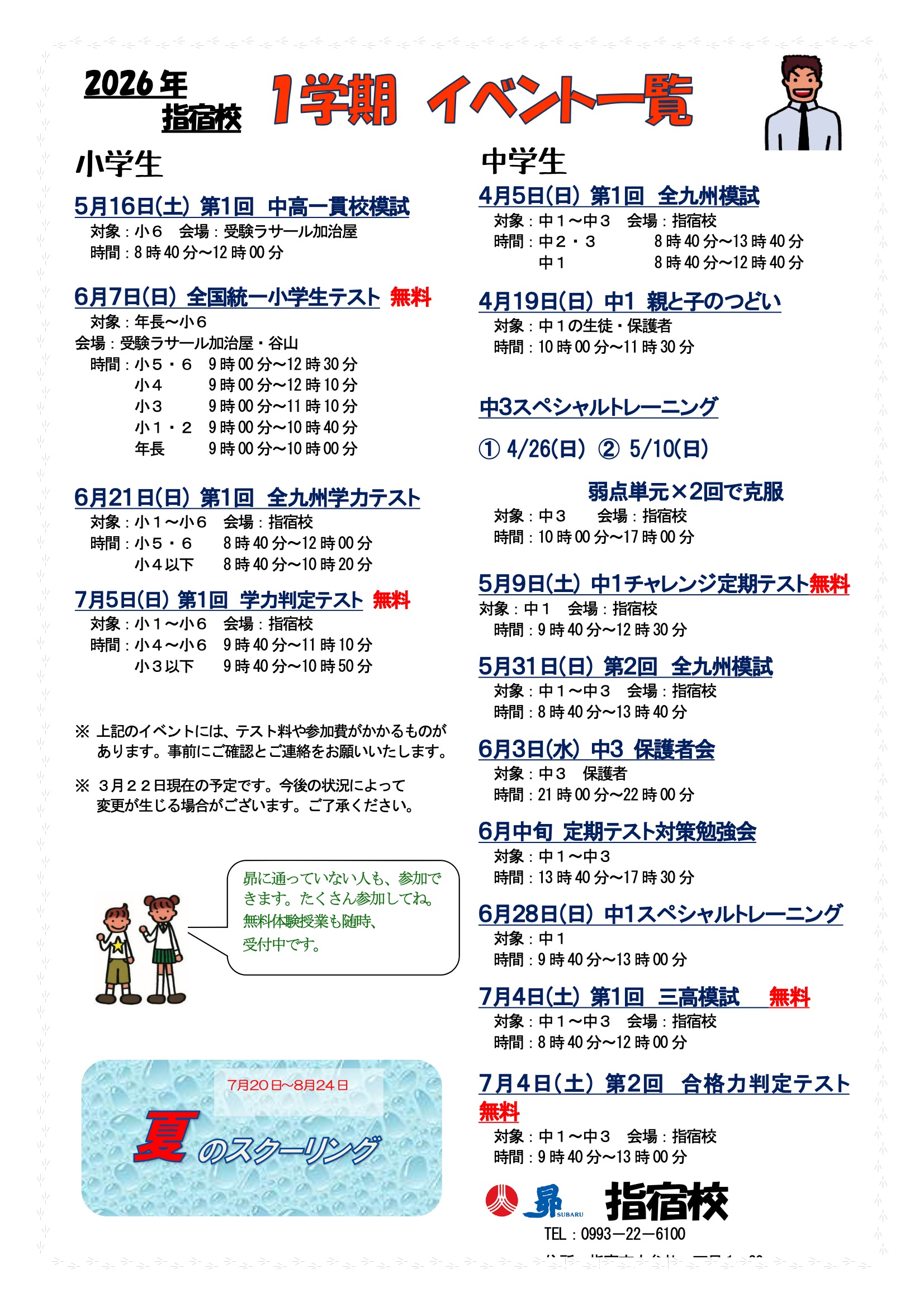トップ教室からのお知らせ鹿児島県指宿校 教室からのお知らせ 指宿校 20263/30 (月) 1学期イベントのお知らせ 20261/30 (金) 昴 指宿校「1月 実力テスト結果!」 20261/5 (月) 【終了】3学期イベントのお知らせ 20258/27 (水) 【終了】2学期イベントのお知らせ 20257/11 (金) 昴 指宿校「1学期期末テスト結果!」 20253/31 (月) 【終了】1学期イベントのお知らせ 20251/15 (水) 【終了】3学期イベントのお知らせ 202411/11 (月) 昴 指宿校生 大躍進!「2学期テスト結果発表」 20248/23 (金) 【終了】2学期イベントのお知らせ 20243/29 (金) 【終了】1学期イベントのお知らせ 20241/12 (金) 【終了】3学期イベントのお知らせ 20238/21 (月) 【終了】2学期イベントのお知らせ 20233/31 (金) 【終了】1学期イベントのお知らせ 20231/10 (火) ★☆2学期期末テスト結果 指宿校生 成績アップ者続出!☆★ 20231/6 (金) 【終了】3学期イベントのお知らせ 20227/19 (火) ★☆1学期期末テスト結果 指宿校生 上位を独占!☆★