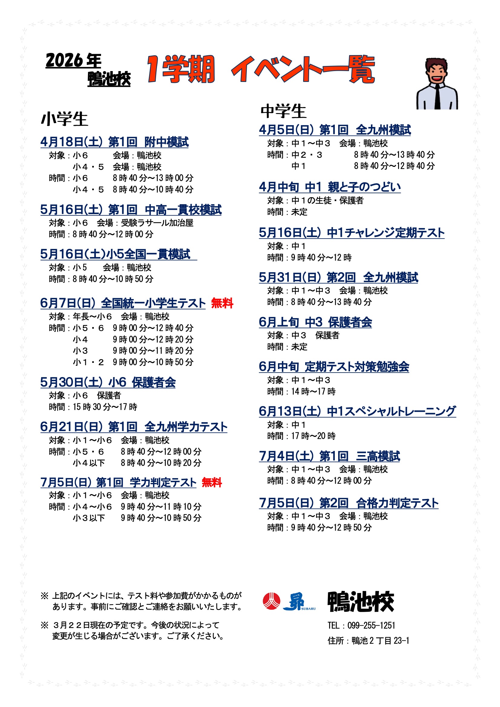 トップ教室からのお知らせ鹿児島県鴨池校 教室からのお知らせ 鴨池校 20263/30 (月) 1学期イベントのお知らせ 20262/13 (金) 2/22(日)実施「学力判定テスト」お申し込み受付中! 20261/5 (月) 【終了】3学期イベントのお知らせ 202512/5 (金) 『2025年第2回 鹿児島市内中3共通実力テスト』昴生結果発表!! 202510/8 (水) 『2025年第1回 鹿児島市内 中3共通実力テスト』昴生結果発表!! 20258/27 (水) 【終了】2学期イベントのお知らせ 20255/14 (水) [2024年第2回]鹿児島市内中3共通実力テスト昴生結果 20253/31 (月) 【終了】1学期イベントのお知らせ 20251/15 (水) 【終了】3学期イベントのお知らせ 20248/23 (金) 【終了】2学期イベントのお知らせ 20247/12 (金) 1学期 期末テスト「昴鴨池校で大きく伸びた!」 20243/29 (金) 【終了】1学期イベントのお知らせ 20241/12 (金) 【終了】3学期イベントのお知らせ 20238/21 (月) 【終了】2学期イベントのお知らせ 20233/31 (金) 【終了】1学期イベントのお知らせ 20231/6 (金) 【終了】3学期イベントのお知らせ