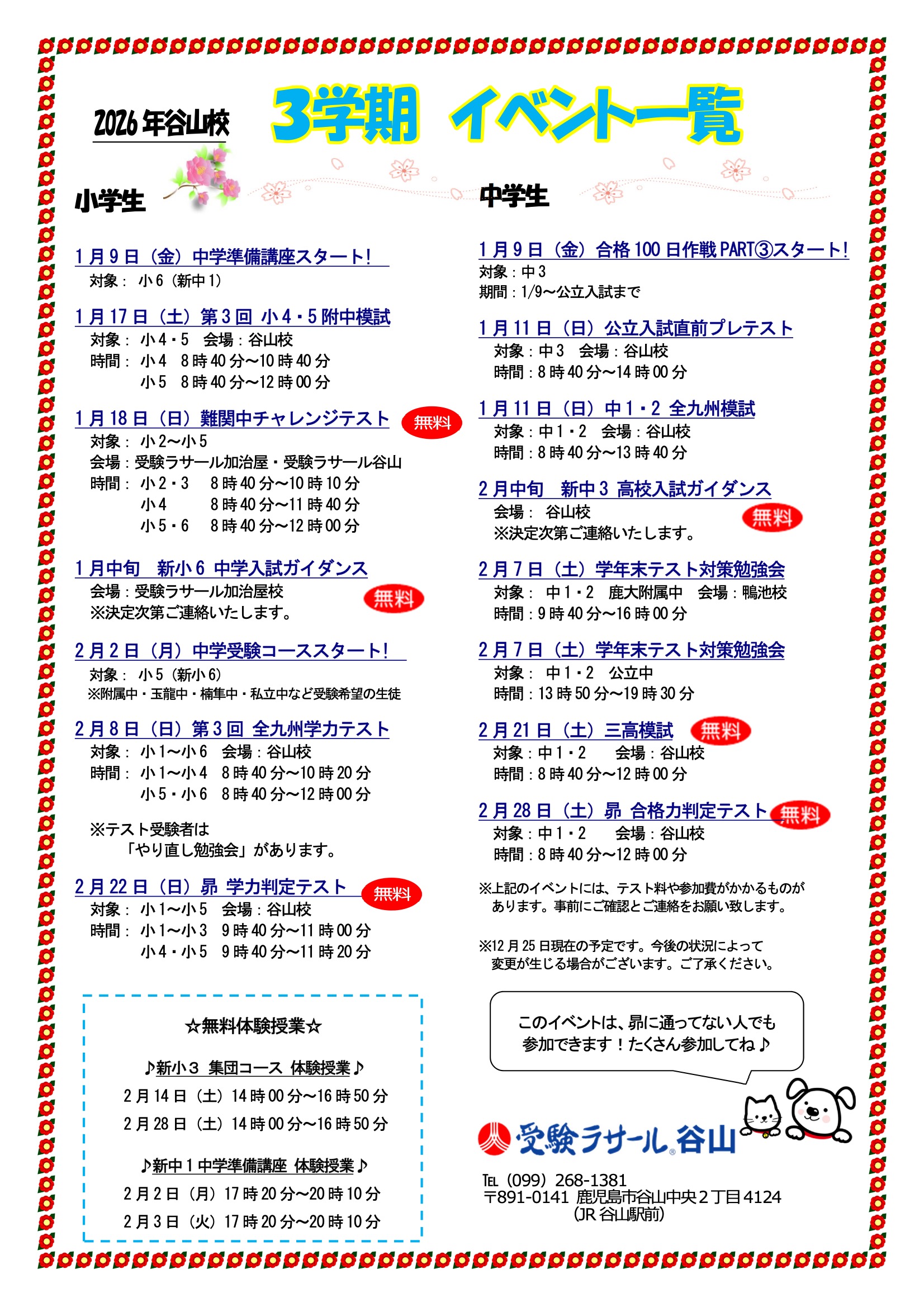 トップ教室からのお知らせ鹿児島県受験ラサール 谷山 教室からのお知らせ 受験ラサール 谷山 20261/26 (月) 受験ラサール谷山:小学生対象『全九州学力テスト』のご案内 20261/5 (月) 3学期イベントのお知らせ 202512/5 (金) 『2025年第2回 鹿児島市内中3共通実力テスト』昴生結果発表!! 202510/8 (水) 『2025年第1回 鹿児島市内 中3共通実力テスト』昴生結果発表!! 20258/27 (水) 【終了】2学期イベントのお知らせ 20255/19 (月) 受ラ谷山校より「6月模擬試験」のご案内 20255/14 (水) [2024年第2回]鹿児島市内中3共通実力テスト昴生結果 20254/28 (月) 受ラ谷山校「新学期無料体験授業」のご案内 20253/31 (月) 【終了】1学期イベントのお知らせ 20251/15 (水) 【終了】3学期イベントのお知らせ 20248/23 (金) 【終了】2学期イベントのお知らせ 20243/29 (金) 【終了】1学期イベントのお知らせ 20241/12 (金) 【終了】3学期イベントのお知らせ 20238/21 (月) 【終了】2学期イベントのお知らせ 20233/31 (金) 【終了】1学期イベントのお知らせ 20232/7 (火) ★☆2学期期末テスト結果 受ラ谷生 成績アップ者続出!☆★ 20231/6 (金) 【終了】3学期イベントのお知らせ 20227/20 (水) ★☆1学期期末テスト結果 受ラ谷生 上位を独占!☆★ 202112/24 (金) 2022年度 受験ラサール谷山小学部 開講説明会のご案内 201912/11 (水) 新年度小学部SSS・SS開講説明会