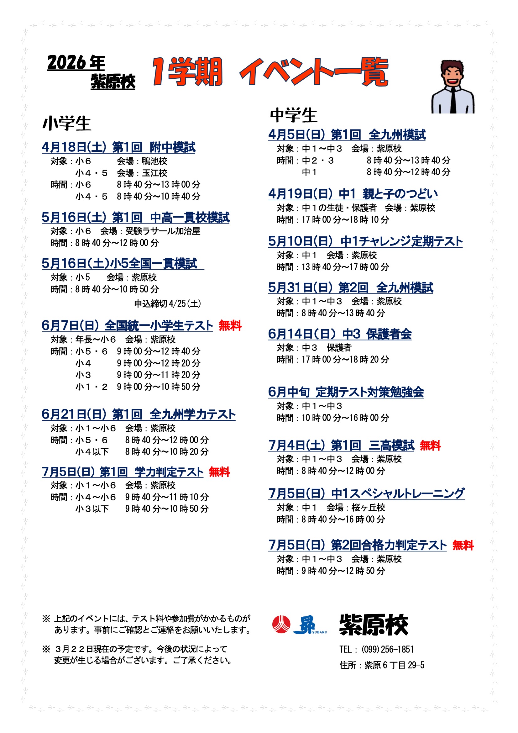 トップ教室からのお知らせ鹿児島県紫原校 教室からのお知らせ 紫原校 20263/30 (月) 1学期イベントのお知らせ 20261/5 (月) 【終了】3学期イベントのお知らせ 202512/5 (金) 『2025年第2回 鹿児島市内中3共通実力テスト』昴生結果発表!! 202510/8 (水) 『2025年第1回 鹿児島市内 中3共通実力テスト』昴生結果発表!! 20258/27 (水) 【終了】2学期イベントのお知らせ 20255/14 (水) [2024年第2回]鹿児島市内中3共通実力テスト昴生結果 20253/31 (月) 【終了】1学期イベントのお知らせ 20251/15 (水) 【終了】3学期イベントのお知らせ 20248/23 (金) 【終了】2学期イベントのお知らせ 20246/13 (木) 6/23(日)実施!小学生対象「学力判定テスト」&「パズル道場DX体験会」 20246/13 (木) 6月実施!中学生対象「期末テスト対策勉強会」 20246/13 (木) 6/22(土) 中1~3「三高模試」~鶴丸・甲南・中央に行きたいなら~ 20243/29 (金) 【終了】1学期イベントのお知らせ 20241/12 (金) 【終了】3学期イベントのお知らせ 20238/21 (月) 【終了】2学期イベントのお知らせ 20233/31 (金) 【終了】1学期イベントのお知らせ 20233/20 (月) ● 昴 紫原校生 大活躍!! 三学期学年末テスト結果【中1.2のみ】♪♪ ● 20231/10 (火) ★☆2学期期末テスト結果 紫原校生 成績アップ者続出!☆★ 20231/6 (金) 【終了】3学期イベントのお知らせ 202112/23 (木) ● 昴 紫原校生 大活躍!! 二学期期末テスト結果♪♪ ●