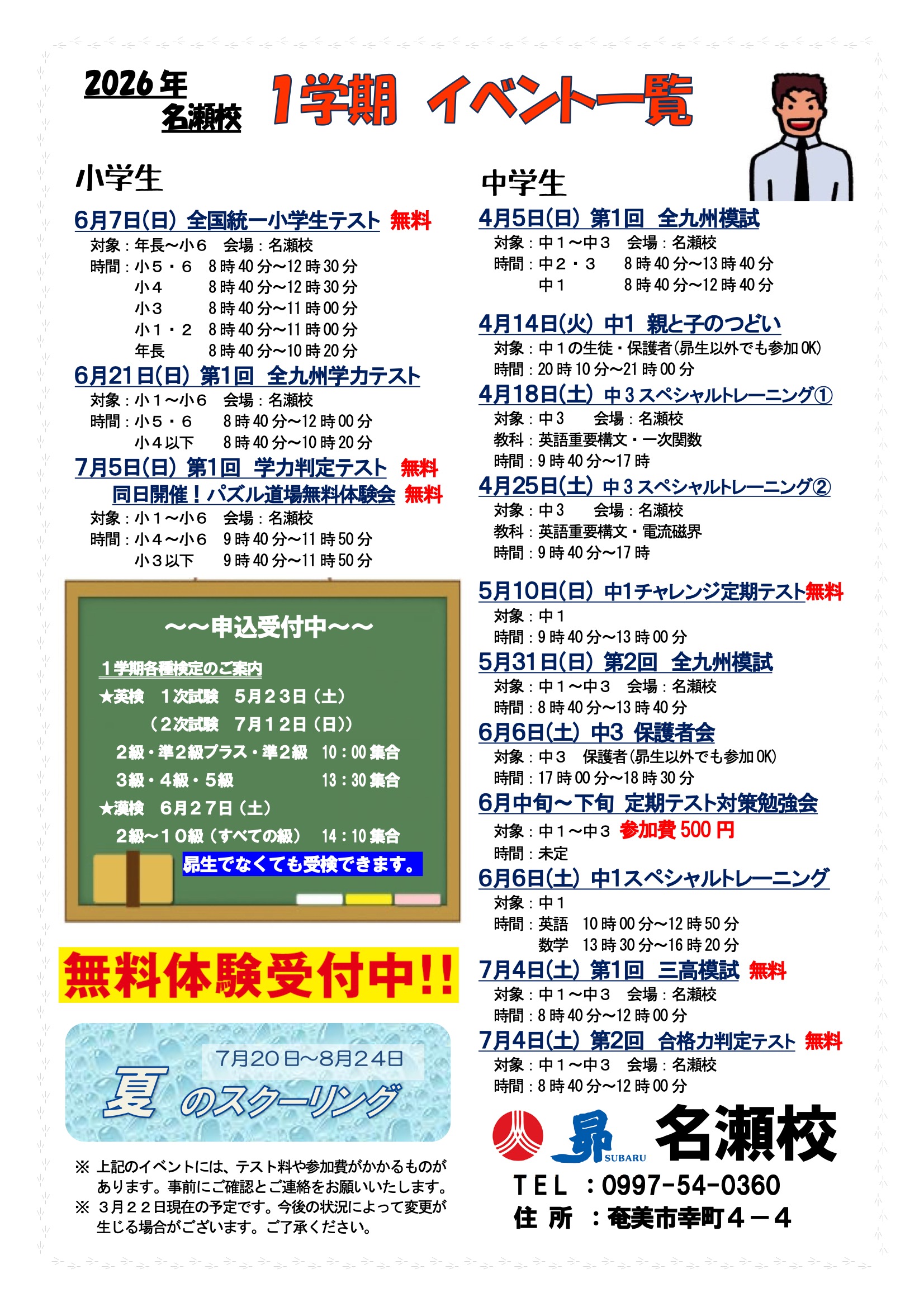 トップ教室からのお知らせ鹿児島県名瀬校 教室からのお知らせ 名瀬校 20263/30 (月) 1学期イベントのお知らせ 20261/5 (月) 【終了】3学期イベントのお知らせ 20258/27 (水) 【終了】2学期イベントのお知らせ 20255/26 (月) 中学生対象「定期テスト対策勉強会」&学校の定期テストがない中学生対象「昴 定期テスト」 20255/26 (月) 「小学生対象 昴名瀬校6月イベント 親子でパズル」 20253/31 (月) 【終了】1学期イベントのお知らせ 20251/15 (水) 【終了】3学期イベントのお知らせ 20248/23 (金) 【終了】2学期イベントのお知らせ 20246/19 (水) 「夏のスクーリング(夏期講習)スケジュール&単元一覧」 20246/6 (木) 中学生対象「学期期末対策&夏のスクーリング(夏期講習)日程」 20246/6 (木) 小学生対象 昴名瀬校6月イベント「親子でパズル」 20243/29 (金) 【終了】1学期イベントのお知らせ 20241/12 (金) 【終了】3学期イベントのお知らせ 20238/21 (月) 【終了】2学期イベントのお知らせ 20233/31 (金) 【終了】1学期イベントのお知らせ 20231/6 (金) 【終了】3学期イベントのお知らせ 20227/13 (水) ★☆1学期期末テスト結果 名瀬校生 TOP3を獲得!☆★