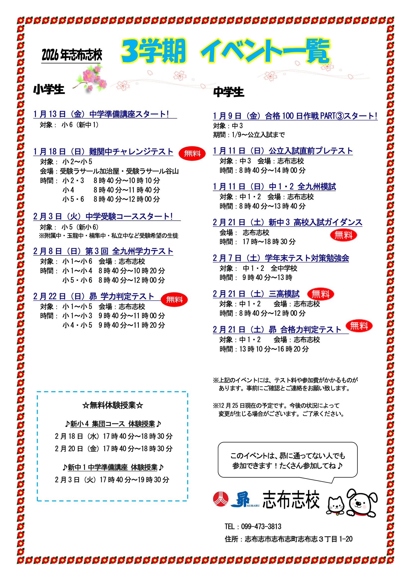 トップ教室からのお知らせ鹿児島県志布志校 教室からのお知らせ 志布志校 20261/5 (月) 3学期イベントのお知らせ 20258/27 (水) 【終了】2学期イベントのお知らせ 20253/31 (月) 【終了】1学期イベントのお知らせ 20251/15 (水) 【終了】3学期イベントのお知らせ 20248/23 (金) 【終了】2学期イベントのお知らせ 20243/29 (金) 【終了】1学期イベントのお知らせ 20241/12 (金) 【終了】3学期イベントのお知らせ 20238/21 (月) 【終了】2学期イベントのお知らせ 20233/31 (金) 【終了】1学期イベントのお知らせ 20231/10 (火) ★☆2学期期末テスト結果 志布志校生 成績アップ者続出!☆★ 20231/6 (金) 【終了】3学期イベントのお知らせ 20228/4 (木) ★☆1学期期末テスト結果 志布志校生 上位を独占!☆★ 20203/4 (水) 春のスクーリングのご案内 20203/4 (水) 2020年合格速報!高専・中高一貫校合格なら昴 20202/17 (月) 2020年合格速報!尚志館高合格なら昴 20201/23 (木) 月刊志布志校2月号 20201/20 (月) 合格一直線! 中3実力テスト結果☆ 201912/25 (水) 月刊志布志校1月号 201912/20 (金) 志布志校生 上位独占! 2学期期末テスト結果☆ 201911/29 (金) 月刊志布志校12月号