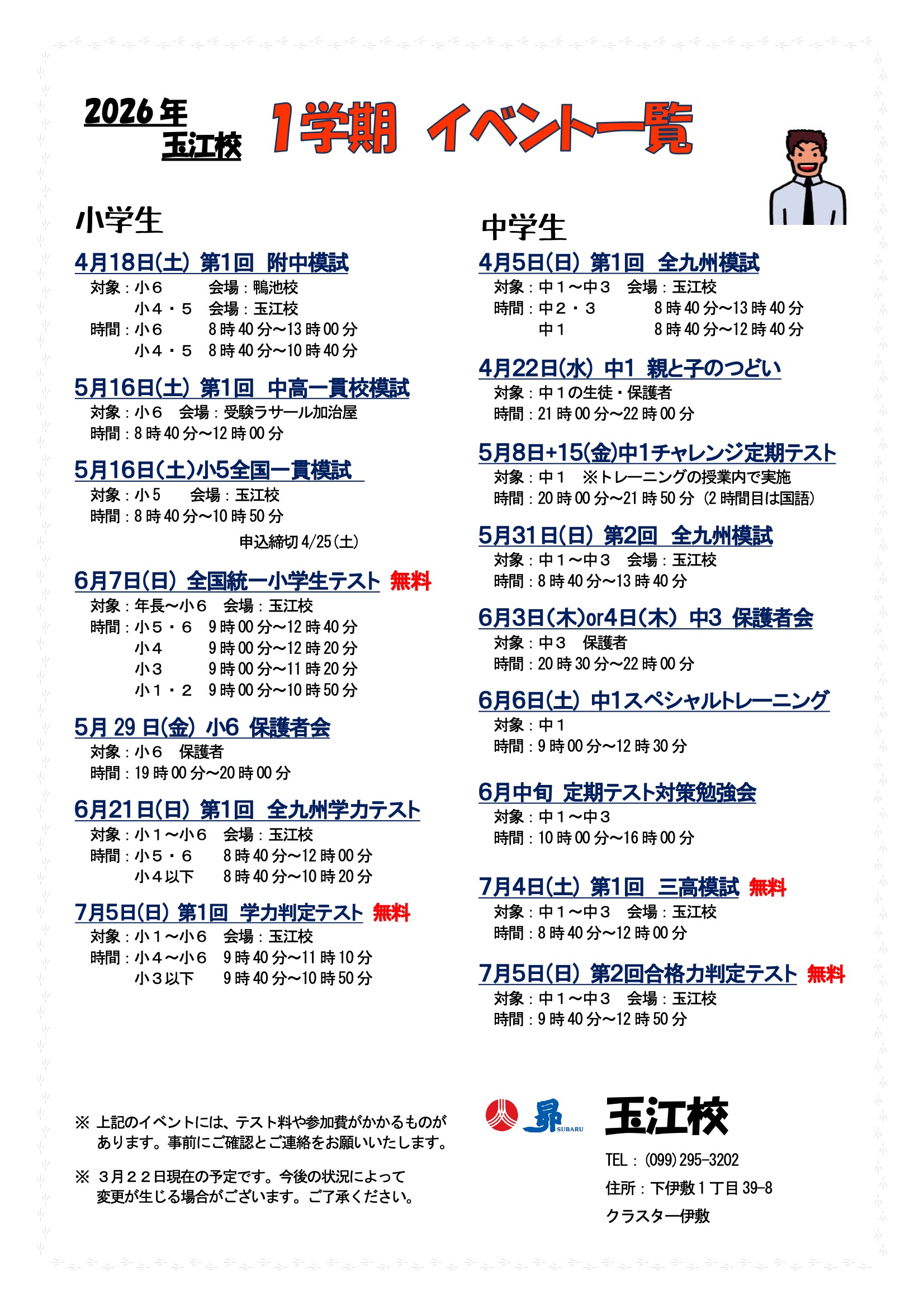 トップ教室からのお知らせ鹿児島県玉江校 教室からのお知らせ 玉江校 20263/30 (月) 1学期イベントのお知らせ 20263/18 (水) 昴 玉江校「2026年 合格速報!(3/18更新)」 20263/13 (金) 昴 玉江校「2026年 合格速報!(3/13更新)」 20262/23 (月) 昴 玉江校「春のスクーリング」お申し込み受付中! 20262/23 (月) 昴 玉江校「無料体験授業」受付中! 20262/23 (月) 昴 玉江校「中3 共通実力テスト結果!」 20261/23 (金) 2/22(日)実施「学力判定テスト」お申し込み受付中! 20261/5 (月) 【終了】3学期イベントのお知らせ 202512/5 (金) 『2025年第2回 鹿児島市内中3共通実力テスト』昴生結果発表!! 202510/8 (水) 『2025年第1回 鹿児島市内 中3共通実力テスト』昴生結果発表!! 20258/27 (水) 【終了】2学期イベントのお知らせ 20255/14 (水) [2024年第2回]鹿児島市内中3共通実力テスト昴生結果 20253/31 (月) 【終了】1学期イベントのお知らせ 20251/15 (水) 【終了】3学期イベントのお知らせ 20248/23 (金) 【終了】2学期イベントのお知らせ 20243/29 (金) 【終了】1学期イベントのお知らせ 20241/12 (金) 【終了】3学期イベントのお知らせ 20238/21 (月) 【終了】2学期イベントのお知らせ 20233/31 (金) 【終了】1学期イベントのお知らせ 20231/6 (金) 【終了】3学期イベントのお知らせ